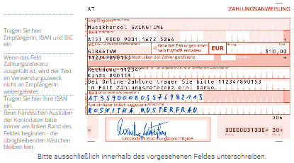 Hier sehen Sie als Beispiel eine vorbedruckte und ausgefüllte SEPA-ZAHLUNGSANWEISUNG innerhalb Österreichs.